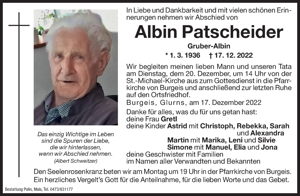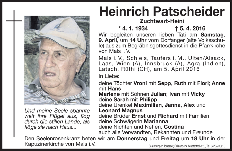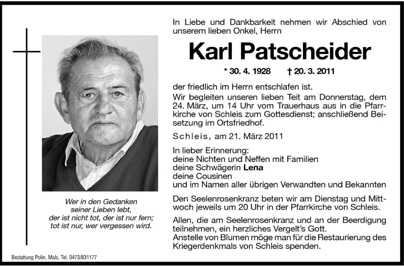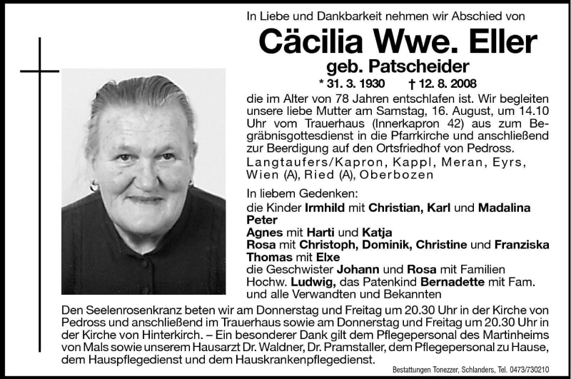 - 5031 Andrä PATSCHEIDER (), m. 1666 in Reschen Maria PIZIN † 1680 children 6051
