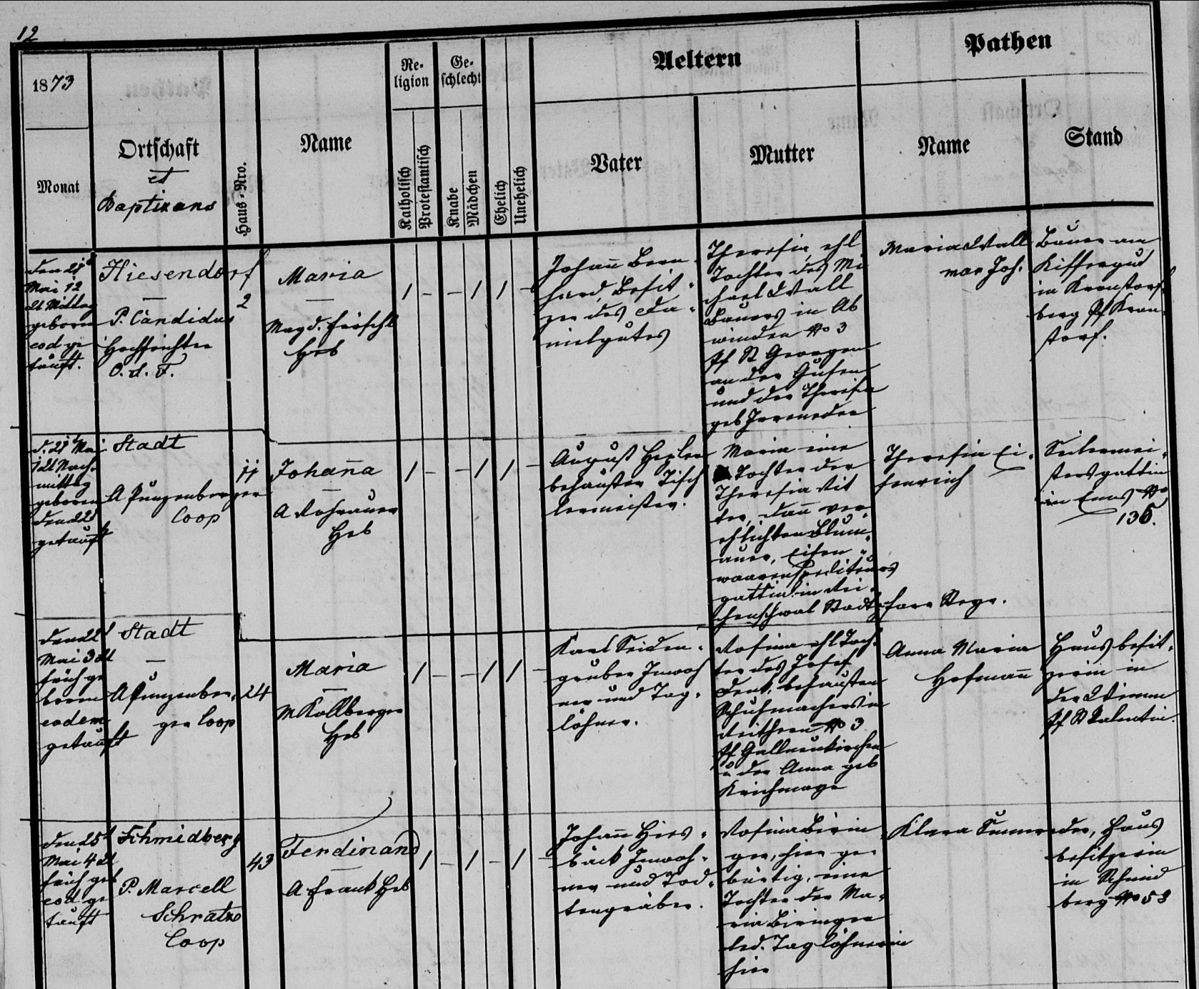 Ferdinand, den 25tn Mai 4 U früh geb. eod (eodem = am gleichen Tag) getauft, Schmidberg 43