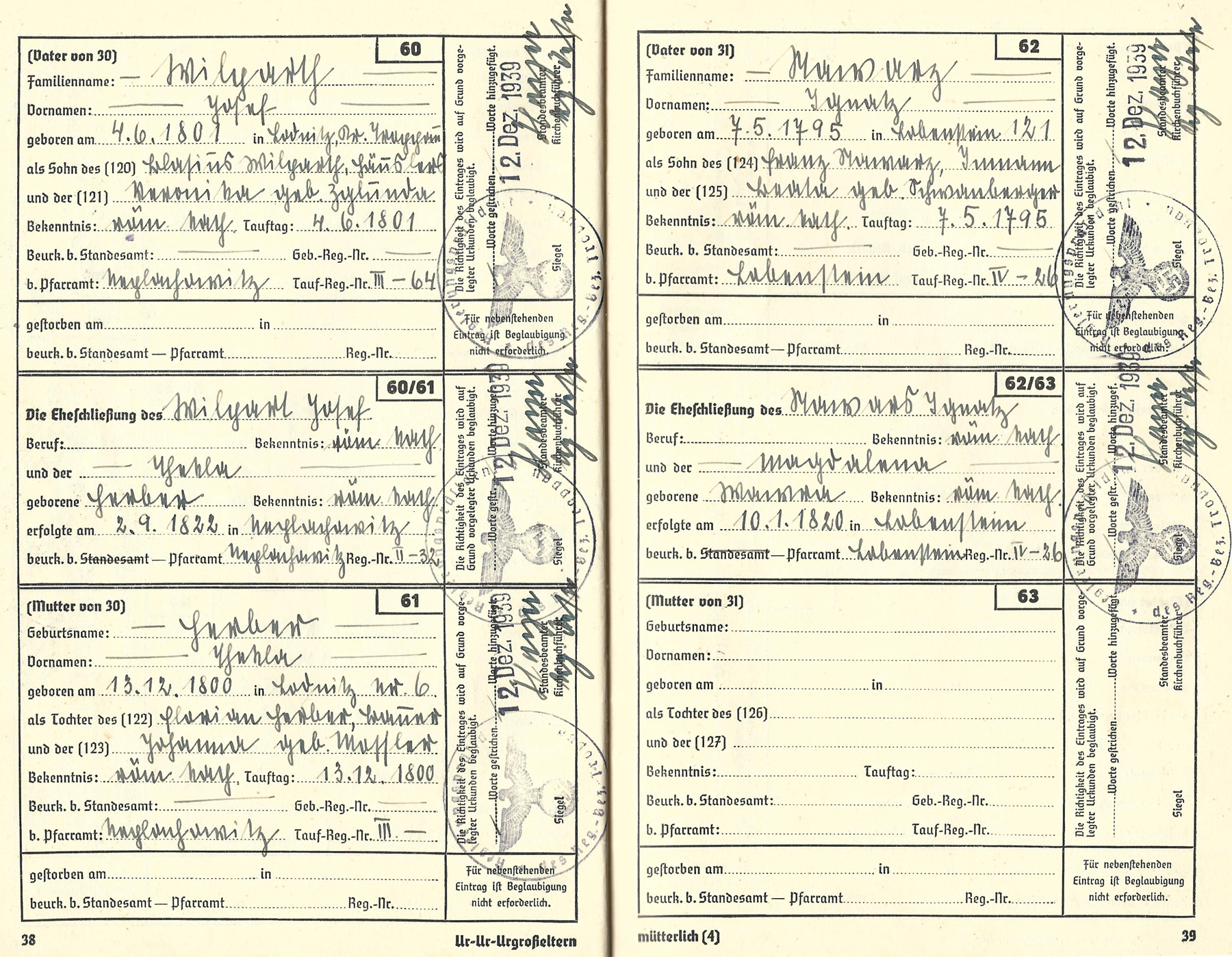 Pfarramt Lobenstein Tauf-Reg.-Nr. IV-26 - Ahnenpass Irimbert Patscheider Seite 39, Nr.: 62/63: